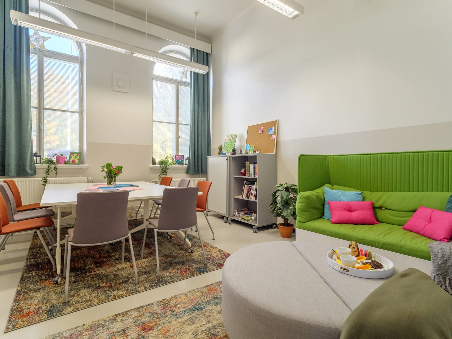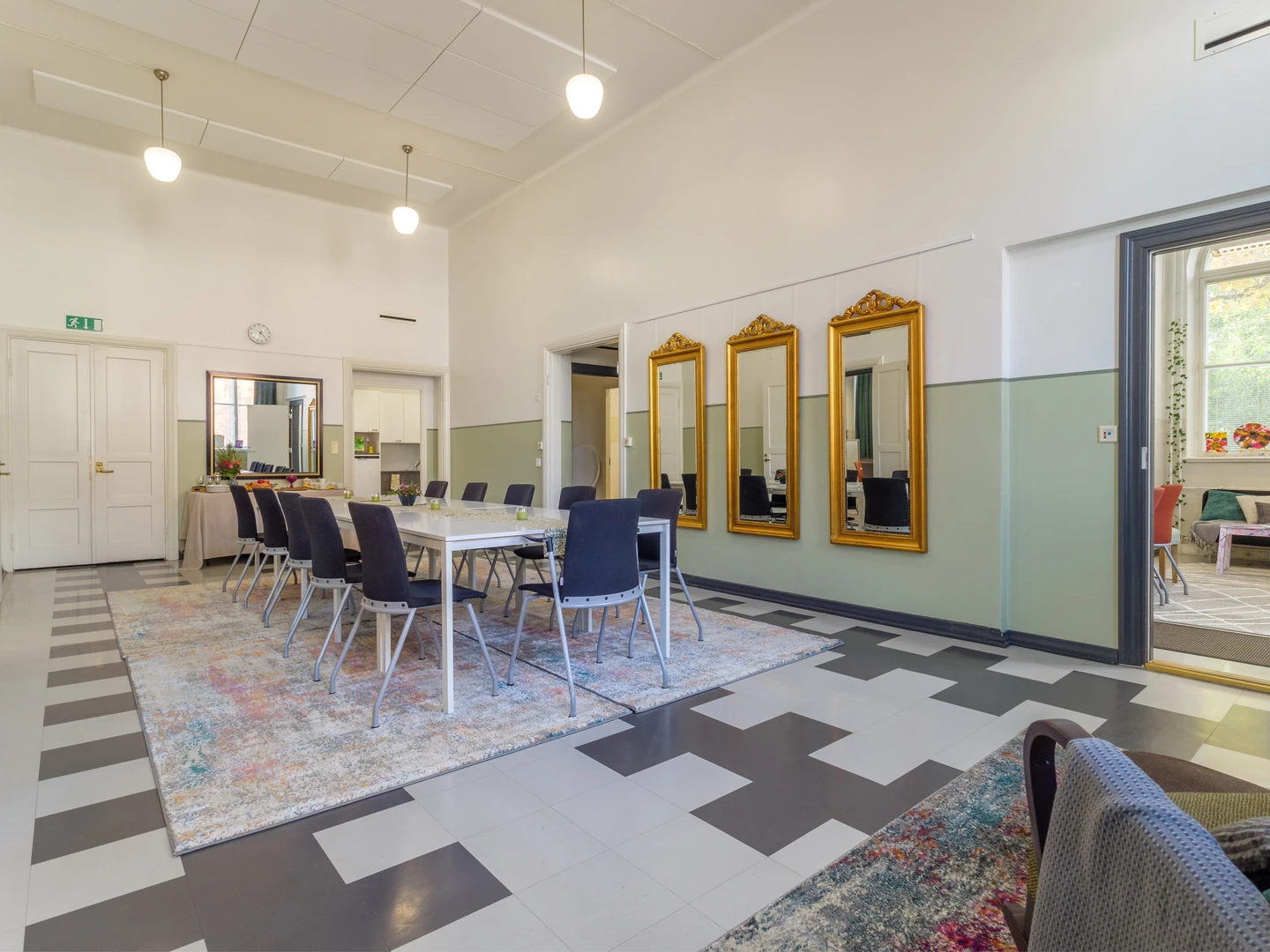 • Muunneltavat ja inspiroivat tilat – Isossa salissa mahtuu mukavasti istumaan ja ruokailemaan samaan aikaan n. 25-30 henkeä, lisäksi käytössäsi on pienempi kokoustila n.10 hengelle sekä kaksi sivuhuonetta oleskeluun tai pienryhmän työskentelyyn.